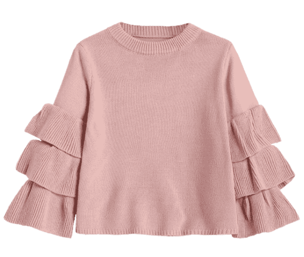 The flouncy layered sleeve pullover sweater has lovely statement sleeves, which is all the trend. This will go great with simple pants.